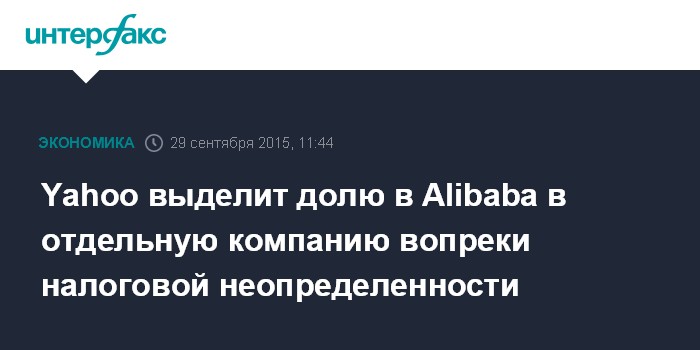 Москва. 29 сентября. INTERFAX.RU – Американская интернет-компания Yahoo! Inc. намерена реализовать обнародованный еще в январе план выделения в независимую компанию своей доли в китайской Alibaba Group, несмотря на неопределенность налогового аспекта сделки.