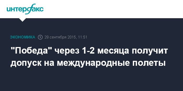 Москва. 29 сентября. INTERFAX.RU – Низкобюджетный авиаперевозчик "Победа" (100%-ная "дочка" "Аэрофлота") может через 1-2 месяца получить возможность выполнять международные полеты.