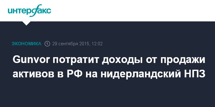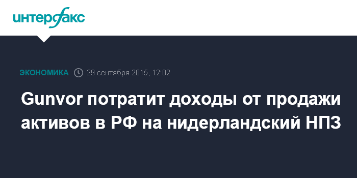Москва. 29 сентября. INTERFAX.RU – Швейцарский сырьевой трейдер Gunvor близок к завершению сделки по покупке еще одного НПЗ в Европе. Приобретение завода Europoort в Роттердаме у кувейтской нефтяной госкорпорации будет профинансировано за счет недавней продажи активов в России, пишет Financial Times со ссылкой на информированные источники.