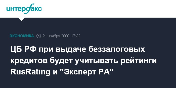 ЦБ РФ при выдаче беззалоговых кредитов будет учитывать рейтинги RusRating и "Эксперт РА"