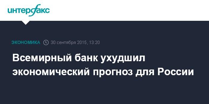 Москва. 30 сентября. INTERFAX.RU – Всемирный банк вернулся к своему апрельскому прогнозу падения российской экономики в 2015 году в базовом сценарии - 3,8%, после улучшения оценки в июне до 2,7%. Такой прогноз Всемирный банк дает в своем 34-м докладе об экономике России "Сложности адаптации и трансформации экономики", опубликованном в среду.