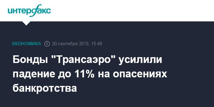 Москва. 30 сентября. INTERFAX.RU – Рублевые облигации "Трансаэро" усилили падение до 11% в ходе дневных торгов на Московской бирже в среду на опасениях банкротства компании.