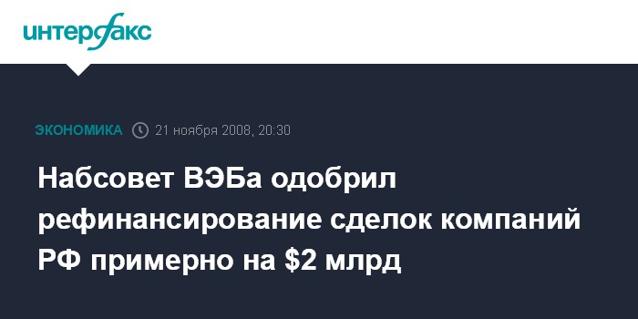Москва. 21 ноября. INTERFAX.RU - Наблюдательный совет Внешэкономбанка (ВЭБа) одобрил участие в рефинансировании ряда сделок предприятий горнорудной промышленности и микроэлектроники, деятельность которых имеет важное социально-экономическое значение для России, на общую сумму около $2 млрд, сообщается в пресс-релизе ВЭБа.