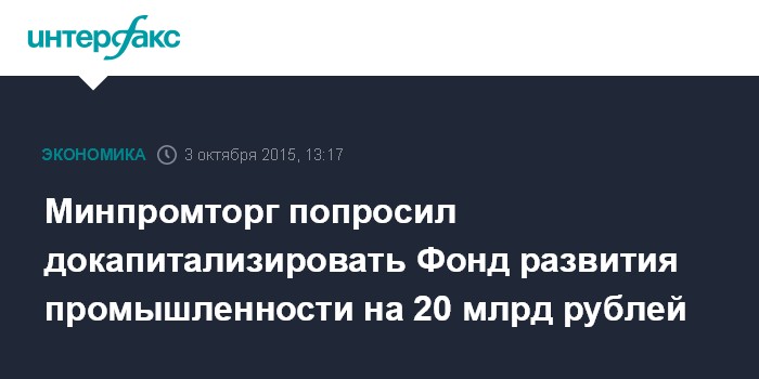 Москва. 3 октября. INTERFAX.RU - Минпромторг просит докапитализировать Фонд развития промышленности минимум на 20 млрд рублей. С соответствующим обращением к премьер-министру РФ Дмитрию Медведеву глава ведомства Денис Мантуров выступил на заседании правительственной комиссии по импортозамещению в субботу.