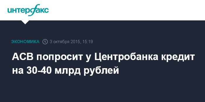 Москва. 3 октября. INTERFAX.RU - Агентство по страхованию вкладов (АСВ) в ближайшее время может обратиться в Банк России за кредитом на сумму 30-40 млрд рублей, сообщил журналистам замминистра финансов РФ Алексей Моисеев.