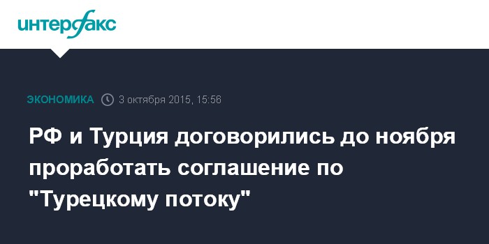 Москва. 3 октября. INTERFAX.RU - Министерства энергетики России и Турции договорились до выборов нового правительства в Турции, назначенных на 1 ноября, проработать текст межправительственного соглашения по газопроводу "Турецкий поток", сообщил в эфире телеканала "Россия 24" министр энергетики Александр Новак.