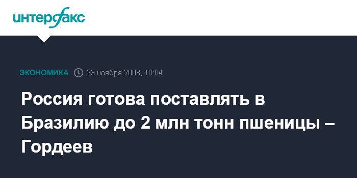 Москва. 23 ноября. INTERFAX.RU - Россия готова поставлять в Бразилию порядка 2 млн тонн пшеницы и увеличить импорт бразильской сои до 1 млн тонн.