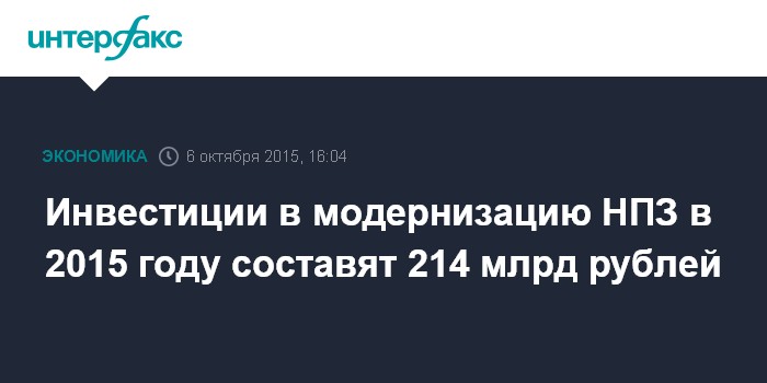 Москва. 6 октября. INTERFAX.RU – Инвестиции в модернизацию нефтеперерабатывающих заводов в 2015 году составят 214 млрд рублей, сообщил премьер-министр Дмитрий Медведев.