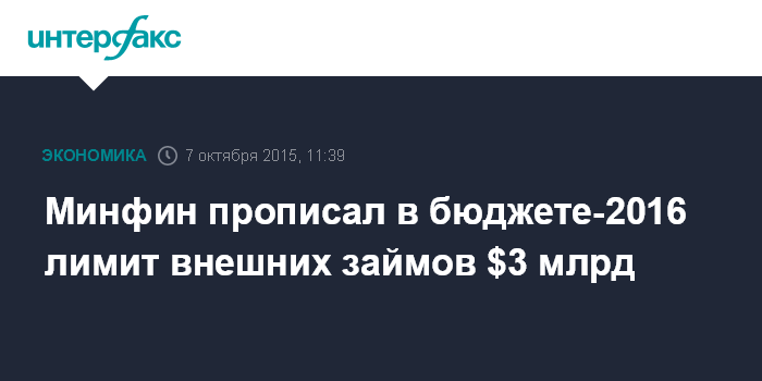 Москва. 7 октября. INTERFAX.RU – Минфин, как и планировал, впервые за несколько лет поменял в бюджете верхнюю планку внешних заимствований. В проекте бюджета-2016, опубликованном ведомством в среду, потолок заимствований на международных рынках капитала определен в $3 млрд против традиционных $7 млрд.