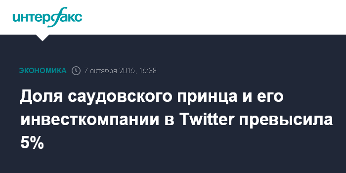 Москва. 7 октября. INTERFAX.RU – Саудовский принц аль-Валид ибн Талал и принадлежащая ему инвесткомпания Kingdom Holdings увеличили долю в Twitter до более 5%, сообщает агентство Bloomberg со ссылкой на сообщение, полученное из офиса принца.