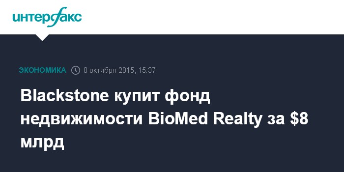 Москва. 8 октября. INTERFAX.RU – Американская Blackstone Group, крупнейшая в мире компания в сфере прямых инвестиций, объявила о приобретении инвестфонда недвижимости BioMed Realty Trust за $8 млрд.