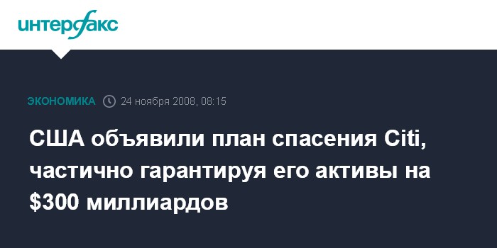 Москва. 24 ноября. INTERFAX.RU - Денежные власти США официально объявили о предоставлении помощи Citigroup, которая включает в себя "защиту" от возможных потерь активов банка на $306 миллиардов. Группа предоставит Минфину привилегированные акции на $20 млрд в качестве компенсации за гарантии.Власти США предоставят также $20 млрд в капитал банка.