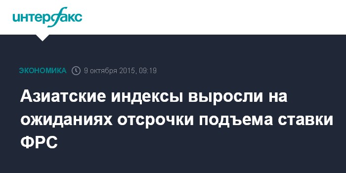 Москва. 9 октября. INTERFAX.RU - Азиатские фондовые индексы растут в пятницу после публикации протокола сентябрьского заседания Федеральной резервной системы (ФРС), показавшего, что американский ЦБ не спешит с подъемом ставки, сообщает агентство Bloomberg.