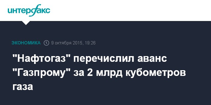 Москва. 9 октября. INTERFAX.RU - НАК "Нафтогаз Украины" перечислил аванс ОАО "Газпром" за 2 млрд куб. м природного газа, сообщили агентству "Интерфакс-Украина" в пресс-службе госхолдинга в пятницу вечером. Тем самым "Нафтогаз Украины" подтвердил свои намерения приобрести в октябре данный объем газа.