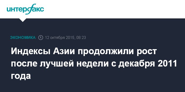 Москва. 12 октября. INTERFAX.RU - Азиатские фондовые индексы в понедельник продолжают демонстрировать подъем вслед за акциями высокотехнологических и промышленных компаний после того, как по итогам прошлой недели прирост рынков был максимальным с декабря 2011 года, сообщило агентство Bloomberg.