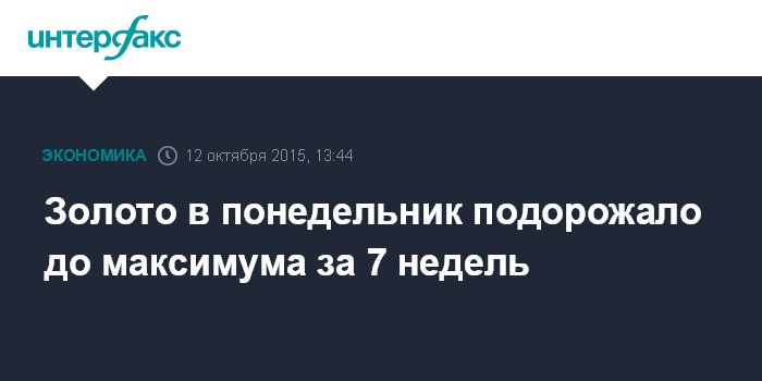 Москва. 12 октября. INTERFAX.RU – Цены на золото в ходе торгов в понедельник выросли до самого высокого уровня за семь недель, инвесторы продолжают оценивать перспективы повышения процентной ставки Федеральной резервной системы до конца 2015 года, сообщает агентство Bloomberg.