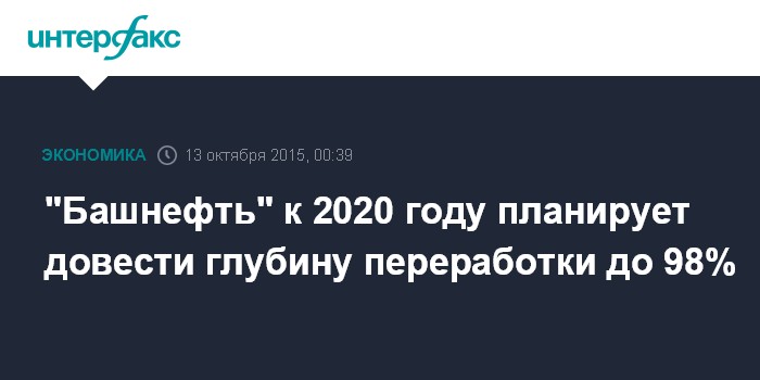 Москва. 13 октября. INTERFAX.RU - Башнефть" в соответствии с утвержденной стратегией до 2020 года планирует довести глубину переработки на своих НПЗ до 98%, выход светлых нефтепродуктов - до 75%, прекратить выпуск мазута, сообщила компания.