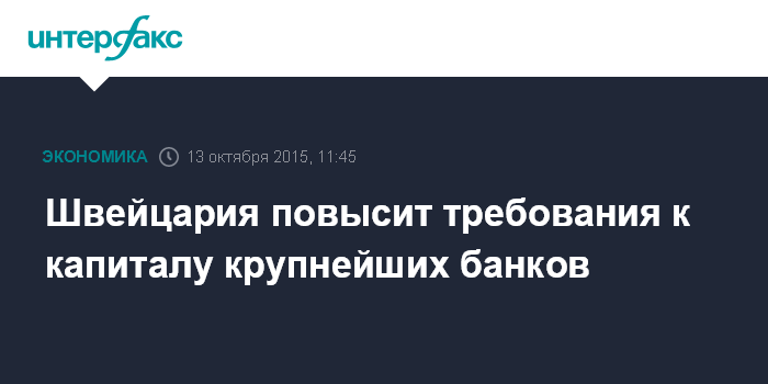 Москва. 13 октября. INTERFAX.RU – Министерство финансов Швейцарии намерено увеличить требования к капиталу крупнейших финкомпаний страны, сообщает агентство Bloomberg со ссылкой на информированные источников.