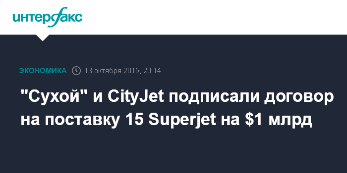 Москва. 13 октября. INTERFAX.RU - АО "Гражданские самолеты Сухого" (ГСС) и ирландская авиакомпания CityJet подписали соглашение, которое предусматривает 15 твердых заказов на поставку самолетов SSJ-100 (Sukhoi Superjet 100) плюс опцион еще на 10 самолетов, сообщает ГСС.