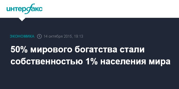 Москва. 14 октября. INTERFAX.RU - Мировое неравенство в доходах растет. По данныим на 2015 год 50% мирового богаства принадлежит 1% населения планеты. Об этом сообщила британская газета The Guardian со ссылкой на доклад Центра исследований швейцарского банка Credit Suisse (Credit Suisse Research Institute).