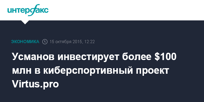 Москва. 15 октября. INTERFAX.RU – USM Holdings Алишера Усманова инвестирует в Virtus.pro - крупнейшее российское сообщество в сфере киберспорта. Инвестиции USM и партнеров в развитие проекта могут превысить $100 млн, говорится в сообщении компании.