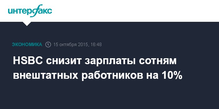 Москва. 15 октября. INTERFAX.RU – Британский банк HSBC Holdings намерен сократить на 10% зарплату всем внештатным сотрудникам инвестиционного подразделения в Лондоне и предоставить им двухнедельный неоплачиваемый отпуск, сообщает агентство Bloomberg со ссылкой на информированный источник.