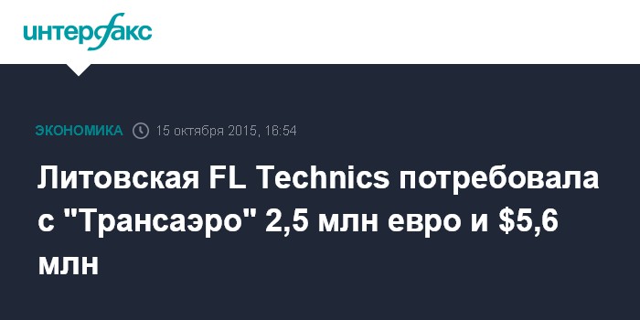 Москва. 15 октября. INTERFAX.RU – Литовская компания FL Technics, входящая в группу компаний Avia Solutions Group, обратилась в Арбитражный суд Москвы с требованием взыскать с "Трансаэро" 2,48 млн евро и $5,609 млн, говорится в материалах на сайте суда.