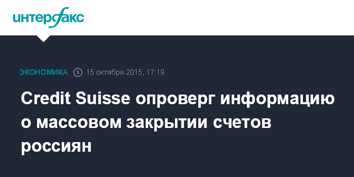Москва. 15 октября. INTERFAX.RU – Швейцарский банк Credit Suisse опроверг информацию о массовом закрытии счетов российских клиентов с балансом до $5 млн.