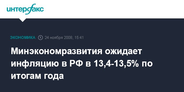Москва. 24 ноября. INTERFAX.RU - Инфляция в РФ в ноябре 2008 г. составит от 0,6% до 0,8%. Такой прогноз сделало Министерство экономического развития и торговли РФ, сообщил "Интерфаксу" источник в одном из профильных ведомств. По итогам года Минэкономразвития ожидает рост потребительских цен в размере 13,4-13,5%, сообщил источник.