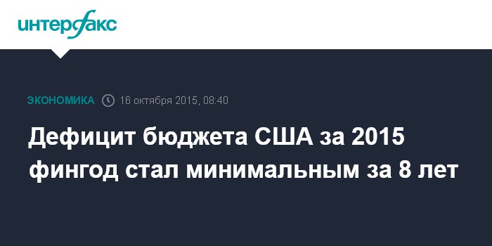 Москва. 16 октября. INTERFAX.RU - Дефицит госбюджета США в 2015 финансовом году, который завершился 30 сентября прошлого года, стал минимальным за последние восемь лет, то есть за время президентства Барака Обамы.