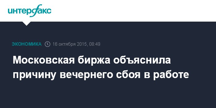 Москва. 16 октября. INTERFAX.RU - Сбой на срочном рынке Московской биржи в четверг вечером был вызван ошибкой в сервисе балансировки риска между срочным и валютным рынками, следует из сообщения биржи.