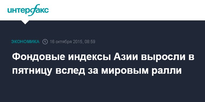 Москва. 16 октября. INTERFAX.RU - Фондовые индексы Азиатско-Тихоокеанского региона (АТР) растут в ходе торгов в пятницу вслед за ралли на ослаблении ожиданий по ставке Федрезерва, увеличившим капитализацию мирового рынка на $4,1 трлн в октябре.