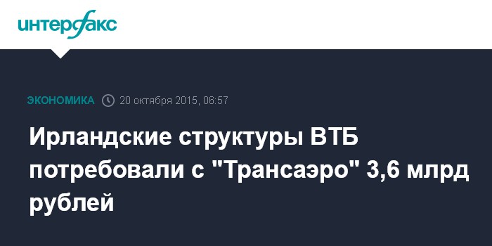 Ирландские структуры ВТБ потребовали с "Трансаэро" 3,6 млрд рублей