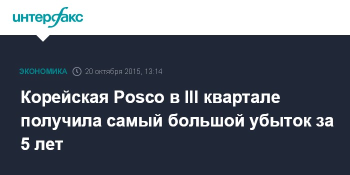 Москва. 20 октября. INTERFAX.RU - Крупнейшая южнокорейская сталелитейная компания Posco в третьем квартале 2015 года получила самый большой чистый убыток как минимум с 2010 года, поскольку рост экспорта стали из Китая привел к снижению мировых цен, сообщает агентство Bloomberg.