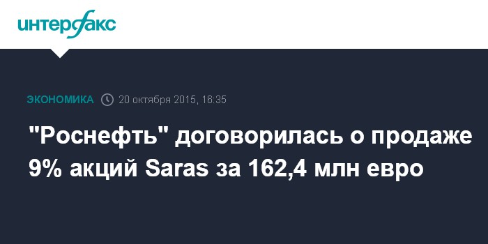 Москва. 20 октября. INTERFAX.RU - Rosneft JV Projects S.A. (Люксембург), косвенное дочернее общество "Роснефти", договорилось о продаже институциональным инвесторам 85 млн 481 тыс. 816 обыкновенных акций итальнской Saras S.p.A., составляющих около 8,99% ее уставного капитала, по цене 1,9 евро за 1 акцию посредством ускоренного предложения с формированием книги заявок, говорится в сообщении российской НК.