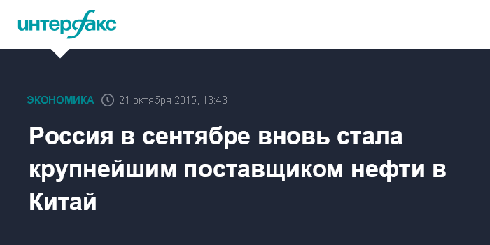 Москва. 21 октября. INTERFAX.RU - Россия в сентябре стала крупнейшим поставщиком нефти в Китай во второй раз в текущем году, свидетельствуют данные Главного таможенного управления КНР.