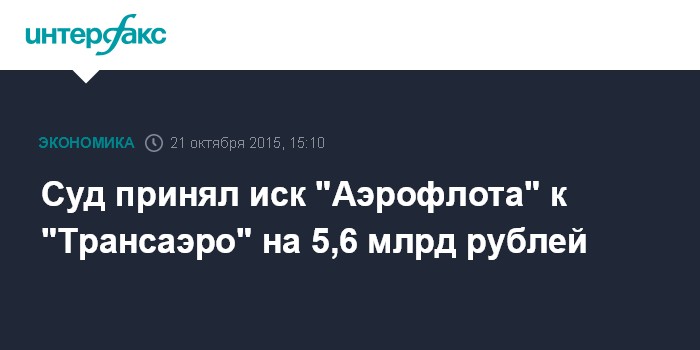 Москва. 21 октября. INTERFAX.RU - Арбитражный суд Москвы принял иск "Аэрофлота" к "Трансаэро" на 5,59 млрд рублей.