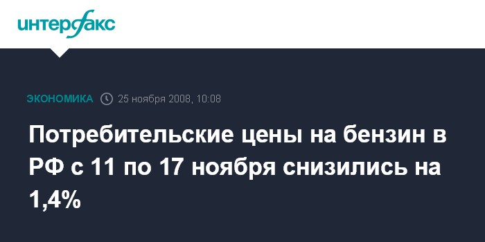 Цены на бензин снижаются уже седьмую неделю подряд. В октябре потребительские цены на автобензин уменьшились на 2,2%, за период с 28 октября по 17 ноября - еще на 4,3%. С начала 2008 г. средние цены на бензин в РФ к 17 ноября поднялись на 11%, стоимость дизельного топлива относительно уровня конца декабря 2007 г. выросла на 19,5%.