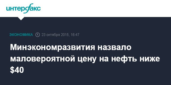 Москва. 23 октября. INTERFAX.RU - Минэкономразвития в свой консервативный сценарий закладывает цену на нефть в $40 за баррель, для целей прогноза более низкая цена не нужна, заявил министр экономического развития Алексей Улюкаев журналистам, комментируя заявление ЦБ, что Банк России в своем пессимистичном сценарии рассматривает вариант цены на нефть "значительно ниже $40".