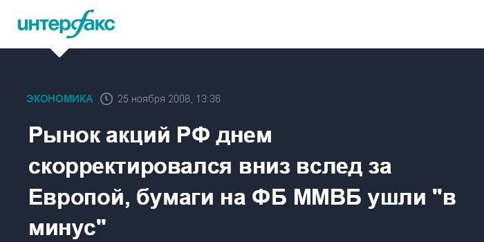 Москва. 25 ноября. INTERFAX.RU - Российский рынок акций, отыграв утром подъем мировых фондовых индексов и нефти накануне, днем скорректировался вниз вслед за европейскими индексами и американскими фьючерсами; бумаги на ФБ ММВБ ушли "в минус".