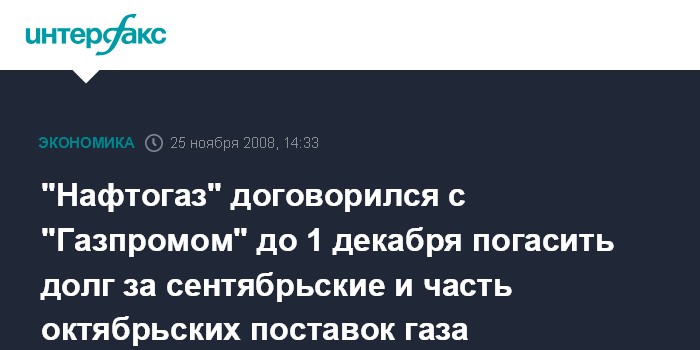 Москва. 25 ноября. INTERFAX.RU - НАК "Нафтогаз Украины" до 1 декабря текущего года погасит задолженность за газ, поставленный в сентябре, и часть задолженности за газ, поставленный в октябре 2008 года.