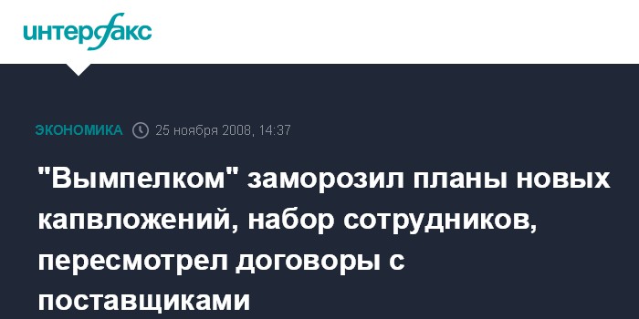 Москва. 25 ноября. INTERFAX.RU - ОАО "Вымпелком" приостановило заказы на новые капитальные вложения, сократило второстепенные статьи затрат, приостановило набор новых сотрудников и пересмотрело ряд договоров с поставщиками оборудования и контрагентами.