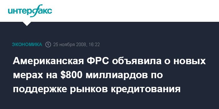 Москва. 25 ноября. INTERFAX.RU - Федеральная резервная система (ФРС) США объявила о двух новых шагах на сумму $800 млрд, направленных на размораживание кредитования для домовладельцев, потребителей и малого бизнеса, сообщило агентство Bloomberg.