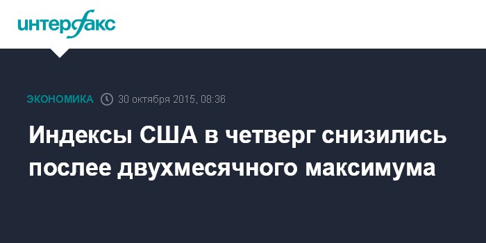 Москва. 30 октября. INTERFAX.RU - Американские фондовые индексы в четверг незначительно снизились после того, как днем ранее Standard & Poor's 500 достиг максимальной отметки за два месяца.