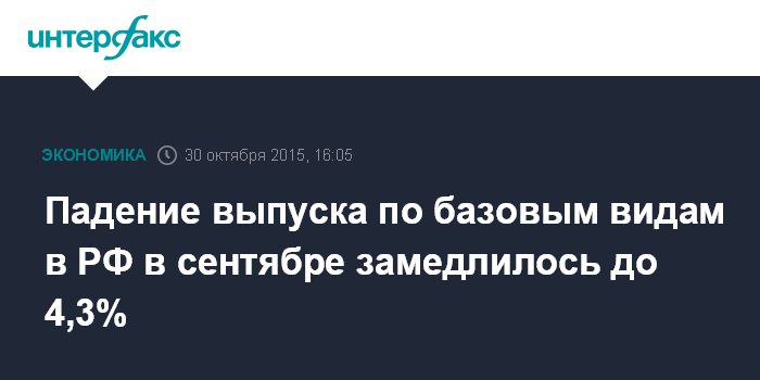 Москва. 30 октября. INTERFAX.RU – Выпуск продукции и услуг по базовым видам экономической деятельности в России в сентябре 2015 года снизился по сравнению с сентябрем 2014 года на 4,3% после падения на 5,2% в августе, 5,9% в июле, на 6,1% в июне, на 6,8% в мае, на 5,8% в апреле, на 2,8% в марте, на 3,1% - в феврале и на 1,1% - в январе, сообщил в пятницу Росстат.