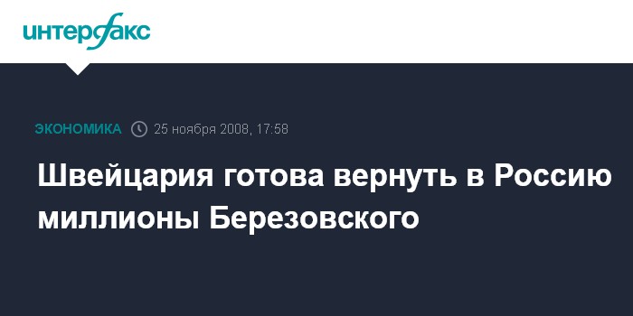 "Федеральный уголовный трибунал Швейцарии 27 октября 2008 г. вынес постановление о конфискации нескольких миллионов франков на счетах в Швейцарии, один из бенефициаров которых был или является Березовский. Решение Федерального уголовного трибунала пока еще не вступило в законную силу", - сказал директор Федерального управления юстиции в федеральном департаменте (министерстве) юстиции и полиции Швейцарии Михаэль Леупольд в интервью "Интерфаксу".