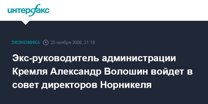 Экс-руководитель администрации Кремля Александр Волошин войдет в совет директоров Норникеля