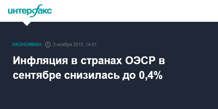 Москва. 3 ноября. INTERFAX.RU – Средний показатель инфляции в странах, входящих в Организацию экономического сотрудничества и развития (ОЭСР), в сентябре 2015 года снизился до 0,4% в годовом исчислении по сравнению с 0,4% в августе, говорится в сообщении организации.