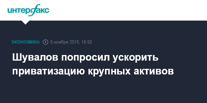 Москва. 5 ноября. INTERFAX.RU – Первый вице-премьер Игорь Шувалов поручил ведомствам проработать возможность ускорения приватизации крупных активов, несмотря на слабую рыночную конъюнктуру, сообщила глава Росимущества Ольга Дергунова.