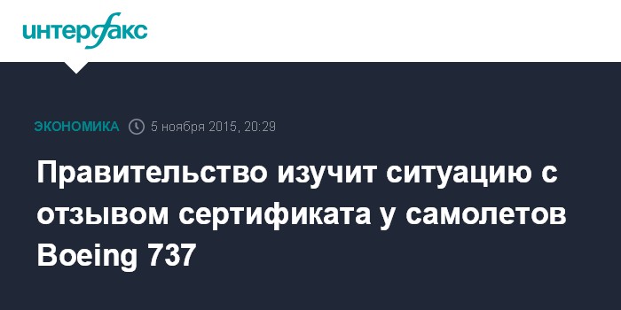 Москва. 5 ноября. INTERFAX.RU – Правительство проанализирует ситуацию в связи с отзывом Международным авиационным комитетом сертификата типа у модификаций самолета Boeing 737, заявил пресс-секретарь президента Дмитрий Песков.